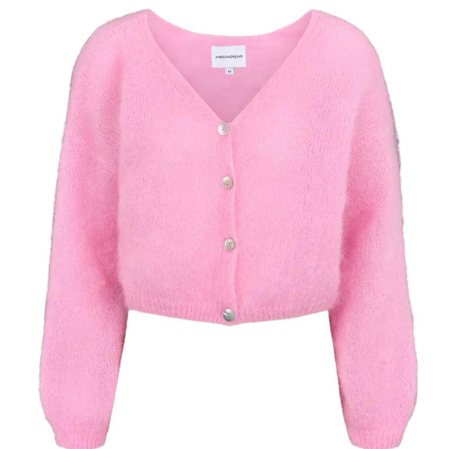 The Cornelia Cropped Cardigan is crafted from fine, thin mohair knitwear material and features a shell button closure. Its cropped length creates an accent at the waist, while the oversized fit adds a trendy and voluminous silhouette.