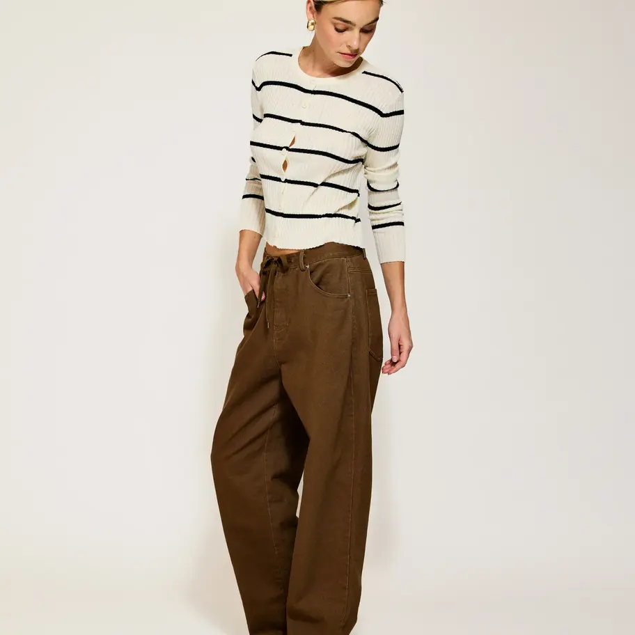 - Mid-weight non-stretch twill- Raw, released hem- Button closure and zip fly- Drawstring waist- pocket styling- Unlined