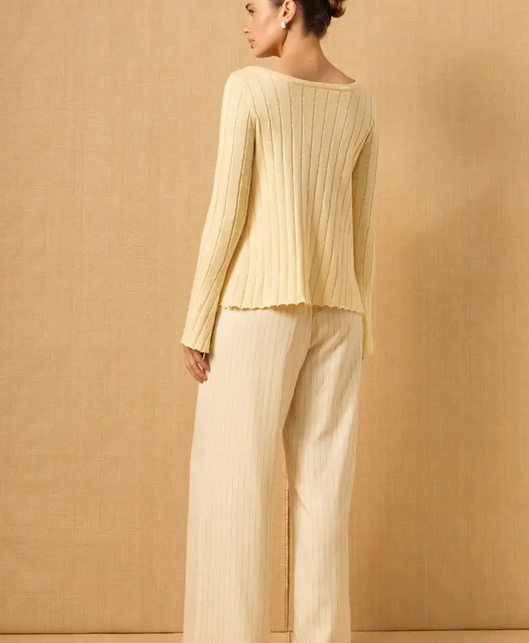- Fully fashioned knitwear- Reversible wear knit top- Relaxed fit- Boat shaped neckline - Long flared sleeves- Featured overlapped opening from shoulder- Wide rib knitting technique- Pull-on style