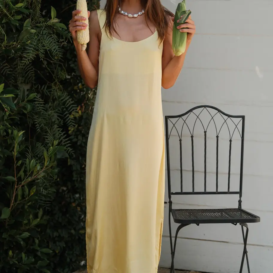 The Silky Cami Dress features a relaxed fit, scoop neck, side slits, and a shelf-bra for support.